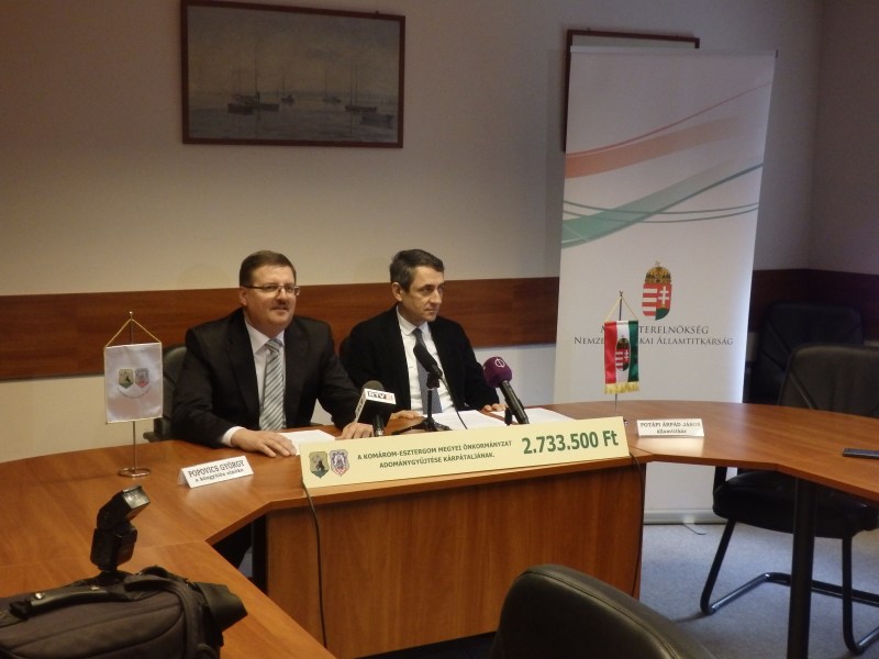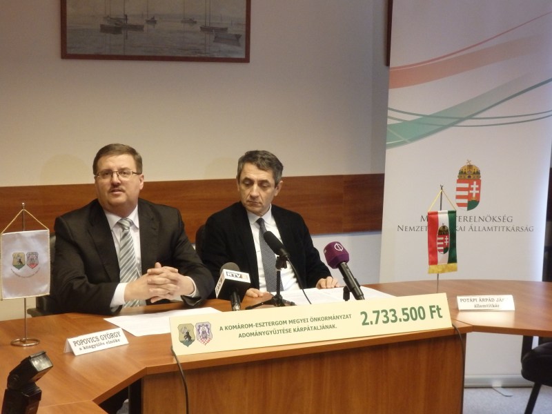 A Komárom-Esztergom Megyei Önkormányzat 2015. júniusában csatlakozott a Nemzetpolitikai Államtitkárság felhívásához, melynek célja a kárpátaljai magyarság megsegítése. A gyűjtés az elmúlt év decemberében befejeződött. Popovics György, a megyei közgyűlés elnöke sajtótájékoztató keretében adta át jelképesen az összegyűlt csaknem 2,8 millió szóló táblát Potápi Árpád nemzetpolitikáért felelős államtitkárnak. Popovics György a sajtó képviselőnek elmondta, hogy az adománygyűjtés sikere az összefogásnak köszönhető, hiszen ebbe a nemes kezdeményezésbe a megyei önkormányzat bevonta a megye gazdasági érdekképviseleteit, a megyei kamarákat, vállalkozói szövetségeket. Ennek a felkérésnek köszönhetően a Nemzeti Agrárgazdasági Kamara Komárom-Esztergom Megyei Igazgatósága, a Komárom-Esztergom Megyei Ipartestületek Szövetsége, a Vállalkozók és Munkáltatók Országos Szövetsége Komárom-Esztergom Megyei Szervezete, a Komárom-Esztergom Megyei Munkaadók és Gyáriparosok Szövetsége valamint a Komárom-Esztergom Megyei Gazdasági Érdekképviseletek Szövetsége első szóra csatlakoztak a felhíváshoz. A felhívás eljutott a megye 76 települési önkormányzatához, a megyei önkormányzat képviselőihez és magánszemélyekhez is, akik szintén csatlakoztak az adománygyűjtéshez. A Komárom-Esztergom Megyei Önkormányzat külön erre a célra létrehozott bankszámlájára december 10-ig 2.733.500 Ft gyűlt össze. A számlára 86 befizetés érkezett, ebből 24 önkormányzat 1.570.000 Ft-ot, 18 gazdasági társaság és érdekképviselet 782. 000 Ft-ot a maradék 381.500 Ft-ot magánszemélyek adományozták. A közgyűlés elnöke kiemelte, hogy az összegyűlt összeget a Miniszterelnökség Nemzetpolitikai Államtitkársága által javasolt szervezetekhez továbbította a megyei önkormányzat 2015. december végén. Ennek köszönhetően Kőrösmezőn 1,233.500 Forintból lajtoskocsit vásároltak a helyi óvoda és általános iskola ivóvíz szükségletének kielégítésére. Másfél millió forintból három település Asztély, Kisbégány, Beregújfalu egyenlő arány ban részesült melyből tűzifát és élelmiszert vásároltak. Potápi Árpád megköszönte, hogy Komárom-Esztergom megye csatlakozott a minisztérium felhívásához és külön kifejezte nagyrabecsülését azoknak, akik munkájukkal, adományukkal hozzájárultak ehhez a kezdeményezéshez. Elmondta, hogy országosan szinten 280 millió forint gyűlt össze a nemzetpolitikai államtitkárság felhívására, de ez közel sem tartalmaz minden felajánlást, hiszen sokan külön szerveztek gyűjtést, és saját maguk el is juttatták adományaikat a rászorulóknak.